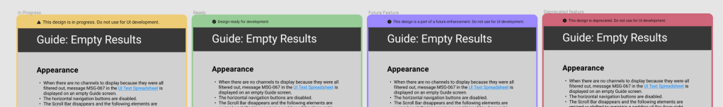 When we design and document in one file, we had developers peering into our work-in-progress files. We had to differentiate between what’s ready for development vs what’s in progress vs what’s future work vs what’s deprecated. There comes design status visibility: